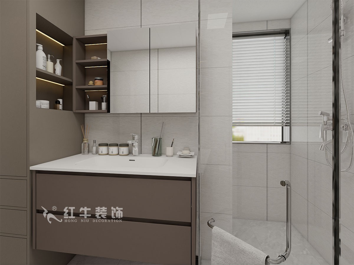 衛(wèi)生間說(shuō)明:干區(qū)選擇整體色彩搭配干凈、大方,選擇大尺寸淺灰色瓷磚上墻,氛圍感溫馨感滿滿。