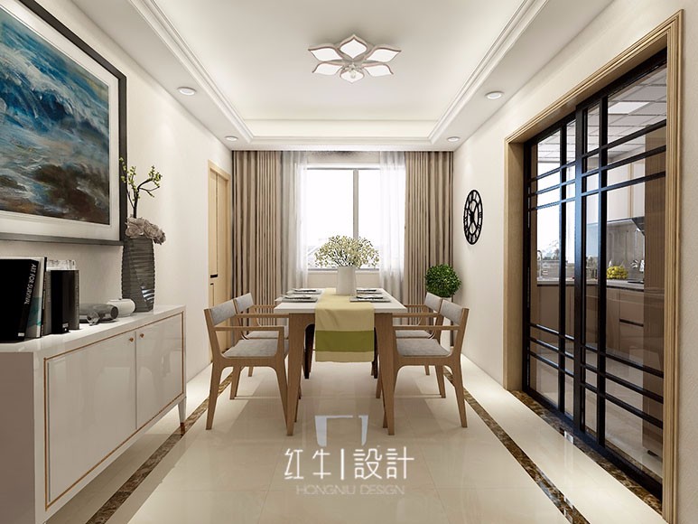 從全面考慮,客廳明亮但不刺眼的光線,使整個空間柔和,干凈,像塊安靜美麗的湖泊。餐廳木頭樸素溫潤的質(zhì)地總是讓人感覺到微暖,身邊有了木頭,就有了身在大自然的親切舒適感。