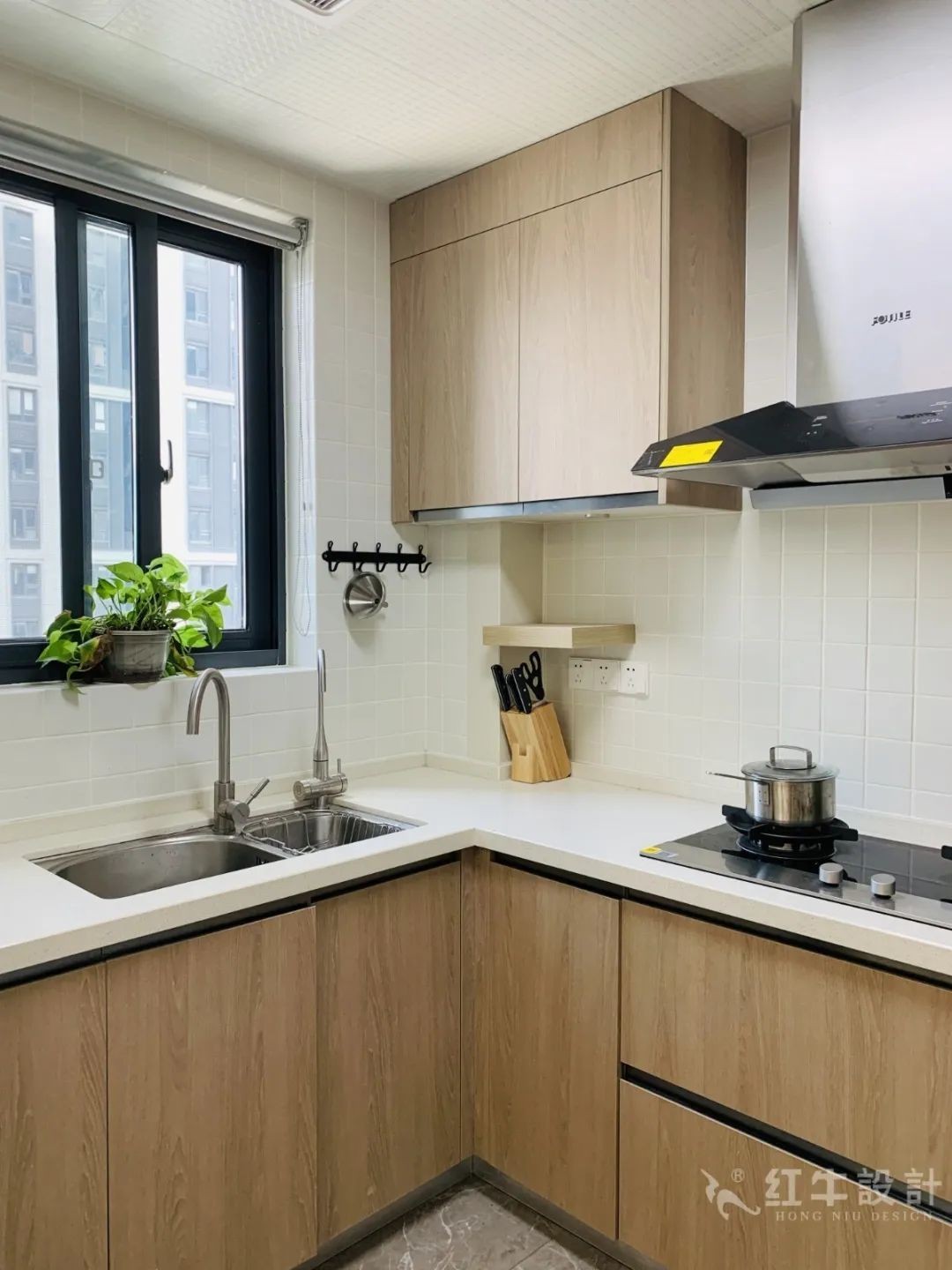 廚房以原木色為基調(diào),搭配白色櫥柜,顯得清新自然,還有開闊的視覺效果。