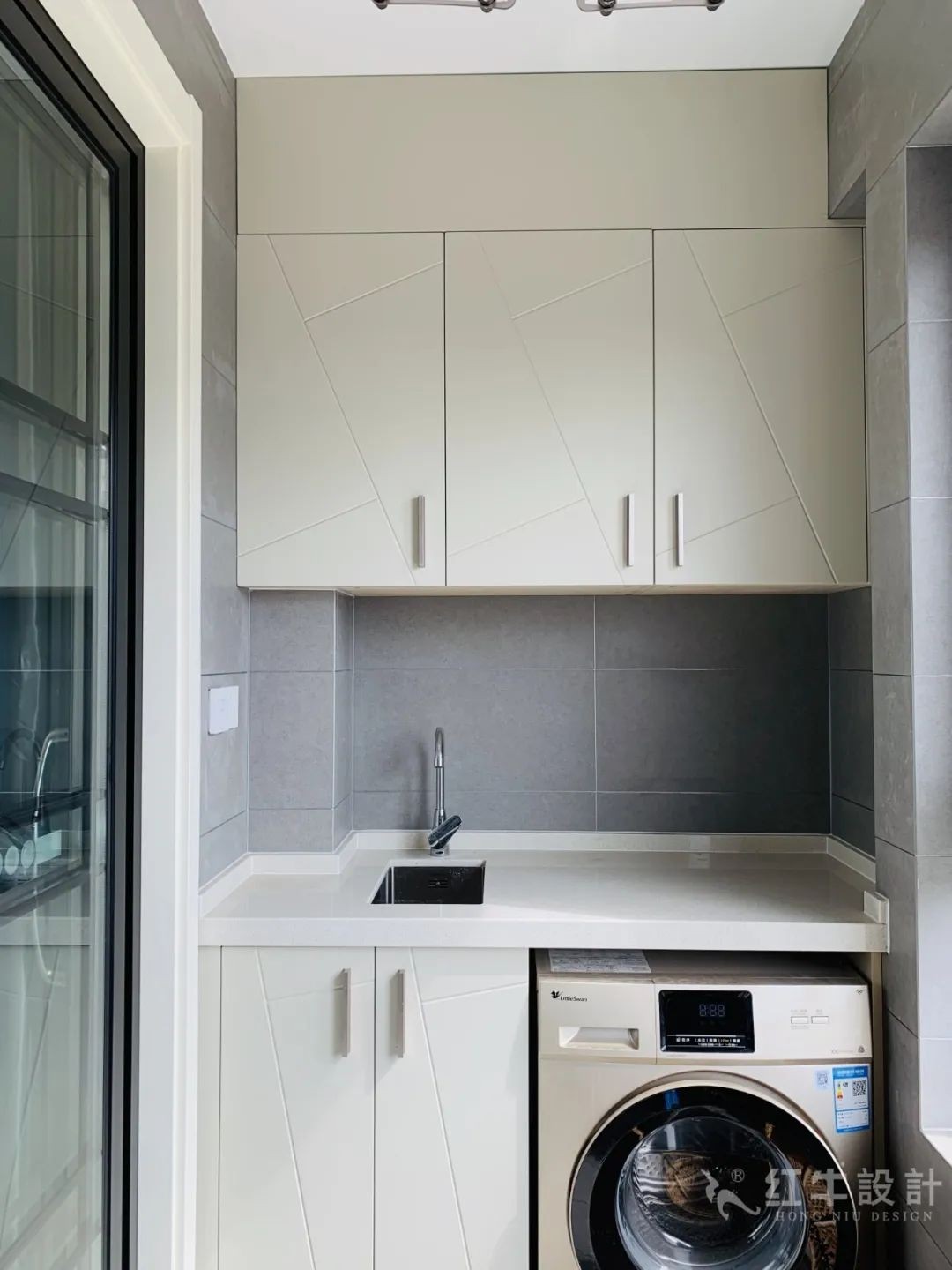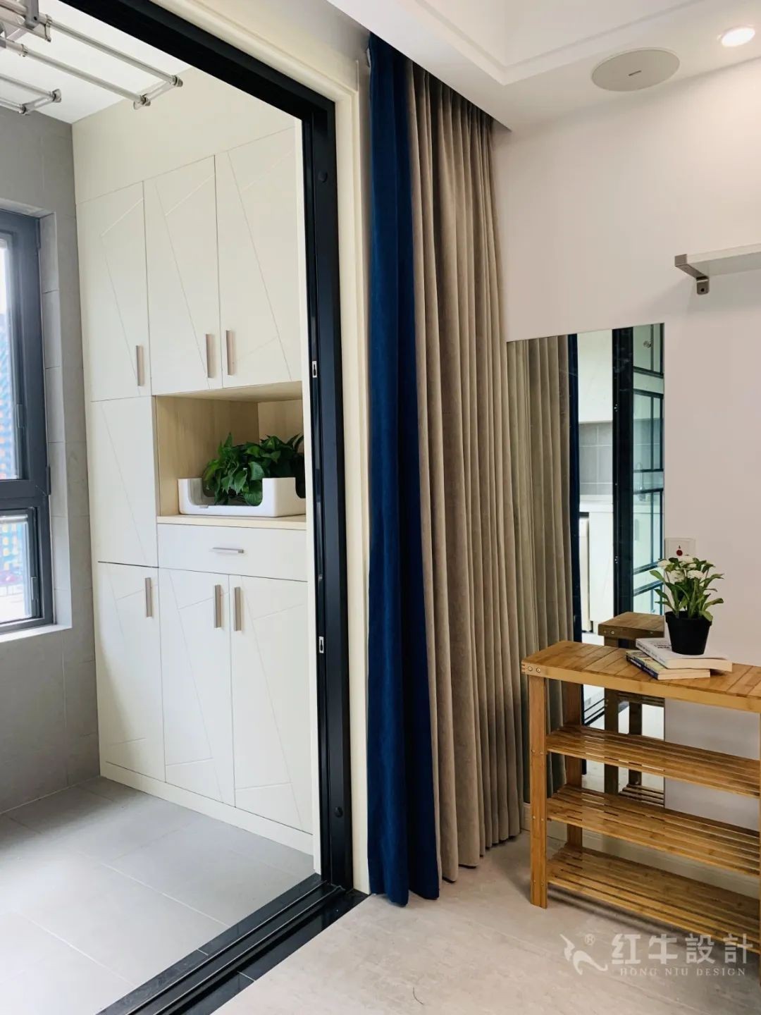 陽臺一側(cè)做成了洗手臺和清潔用品收納柜,把清潔區(qū)搬到陽臺,可以節(jié)省室內(nèi)空間。