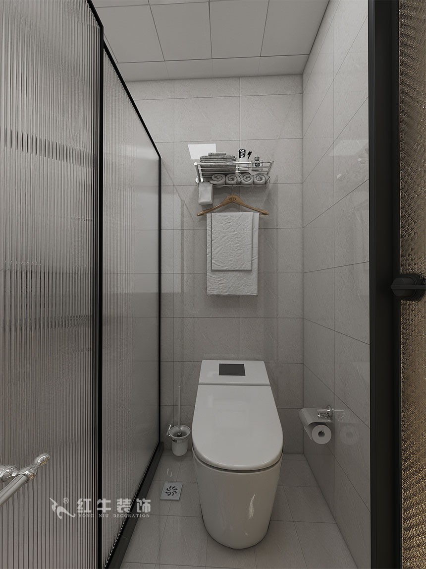 淋浴區(qū)用玻璃隔絕水汽,干濕分離。豎條玻璃在視覺(jué)上有拉高層高的效果,是一種簡(jiǎn)約干練的美學(xué)表達(dá)。