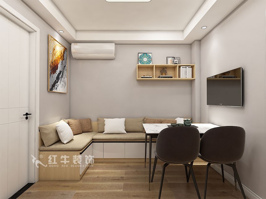 本案設(shè)計(jì)業(yè)主父母自住,卡座設(shè)計(jì)解決沙發(fā)無(wú)法放置的問(wèn)題,增加座位空間,同時(shí)也增加儲(chǔ)物空間。顏色明亮。廚房結(jié)構(gòu)改造一下,解決了客廳可以看見(jiàn)煙機(jī)灶臺(tái)的尷尬。