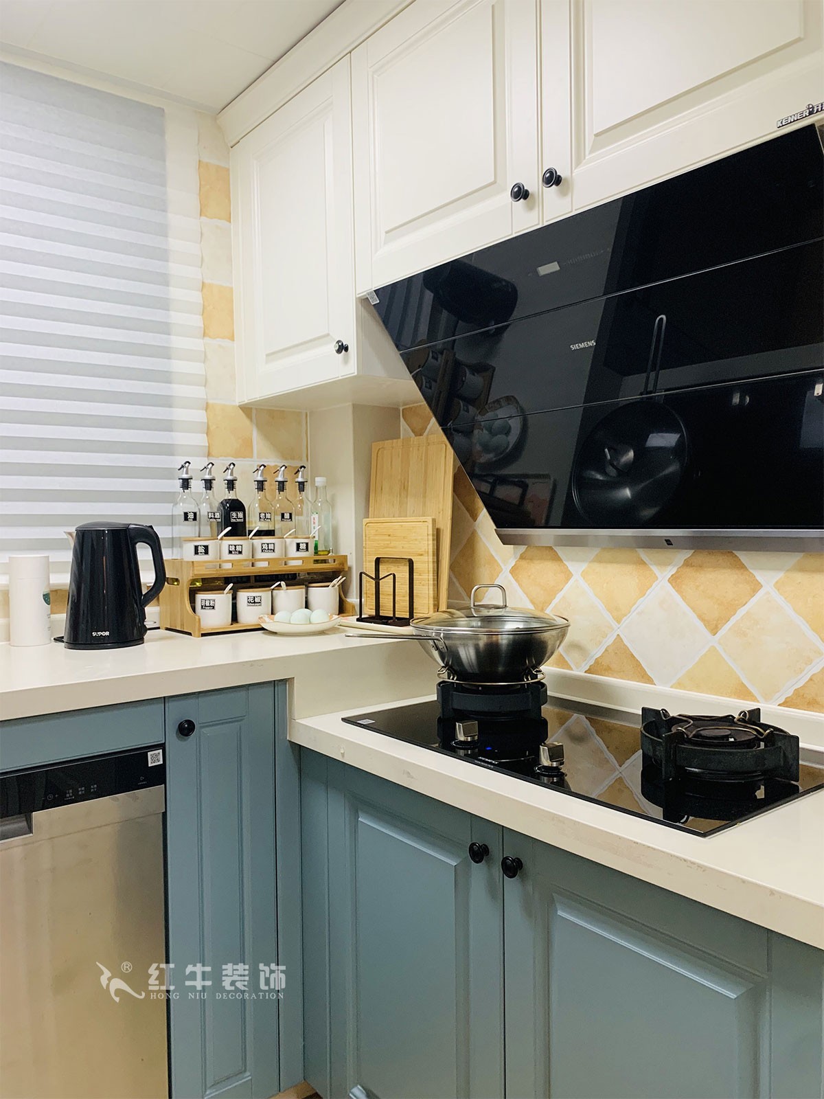 櫥柜柜門(mén)的顏色決定了整個(gè)廚房的色調(diào),給燥熱的廚房空間帶來(lái)一絲清涼。