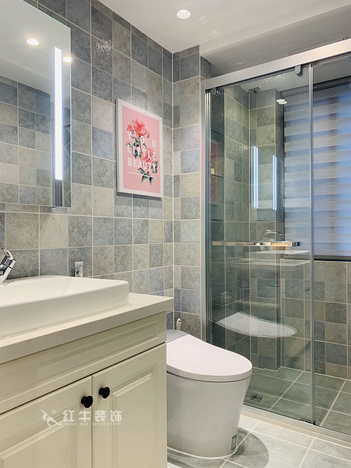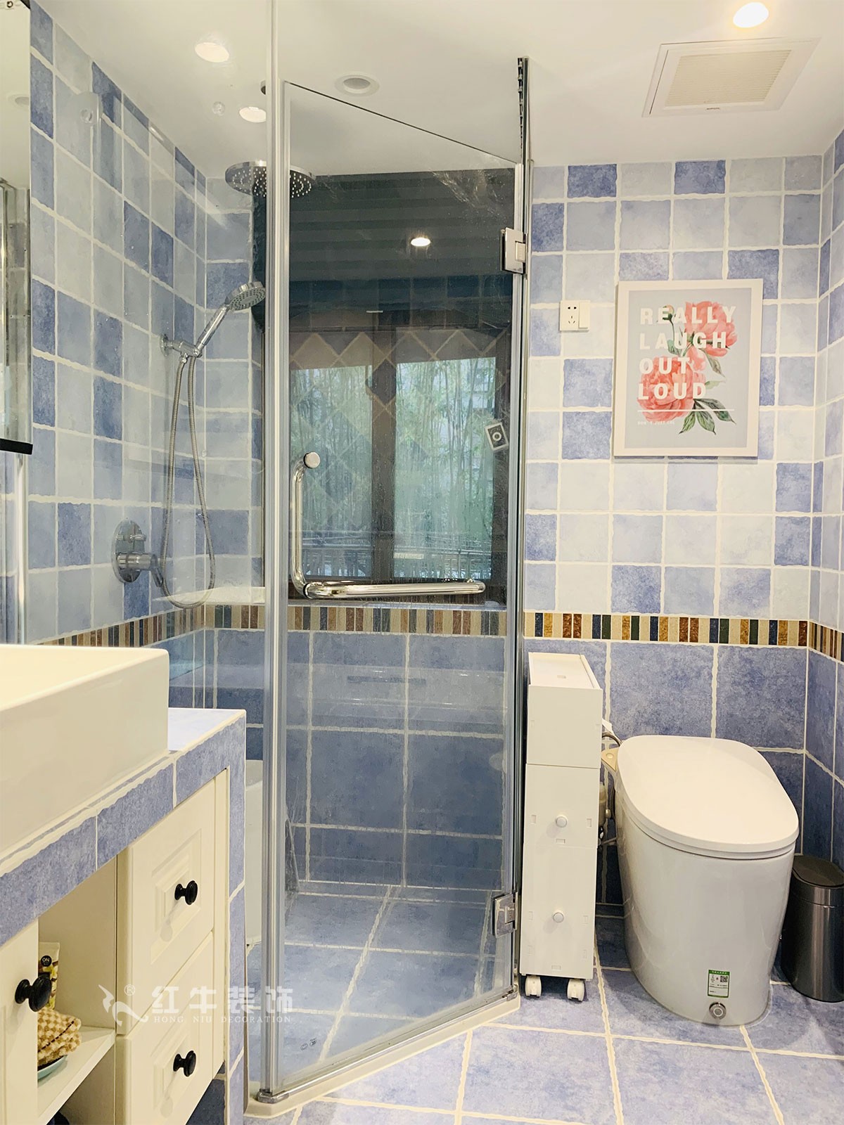 這是主臥的衛(wèi)生間,不同的藍(lán)色、白色瓷磚拼貼在一起,在井然有序中又體現(xiàn)出生動(dòng)和變化,看著感覺(jué)心情舒暢。