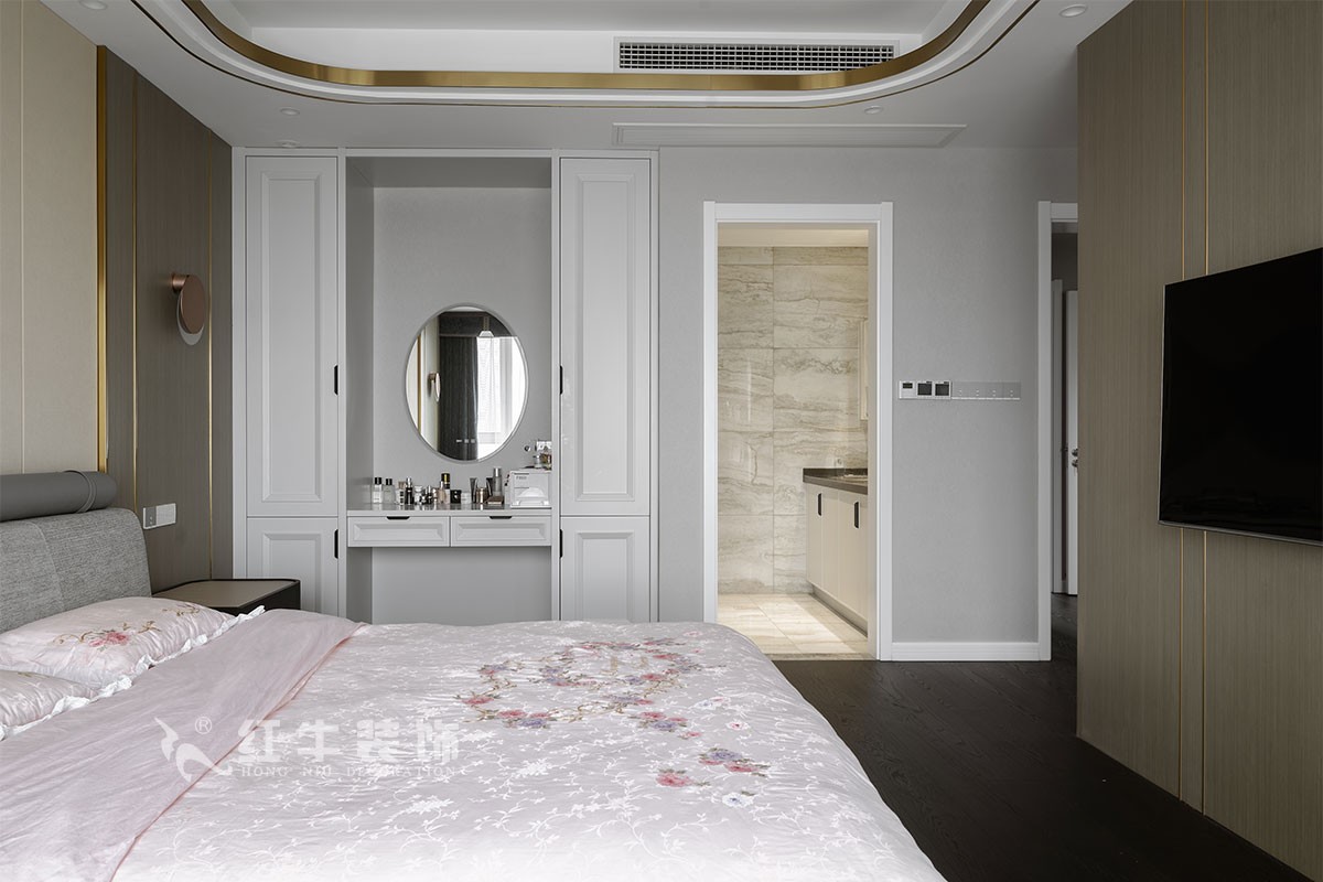 戶型整體比較規(guī)整,主臥室和書房根據(jù)業(yè)主的空間需求做了一個(gè)套房形式,臥室、衛(wèi)生間、衣帽間、書房形成了一個(gè)相對(duì)獨(dú)立的私密空間。